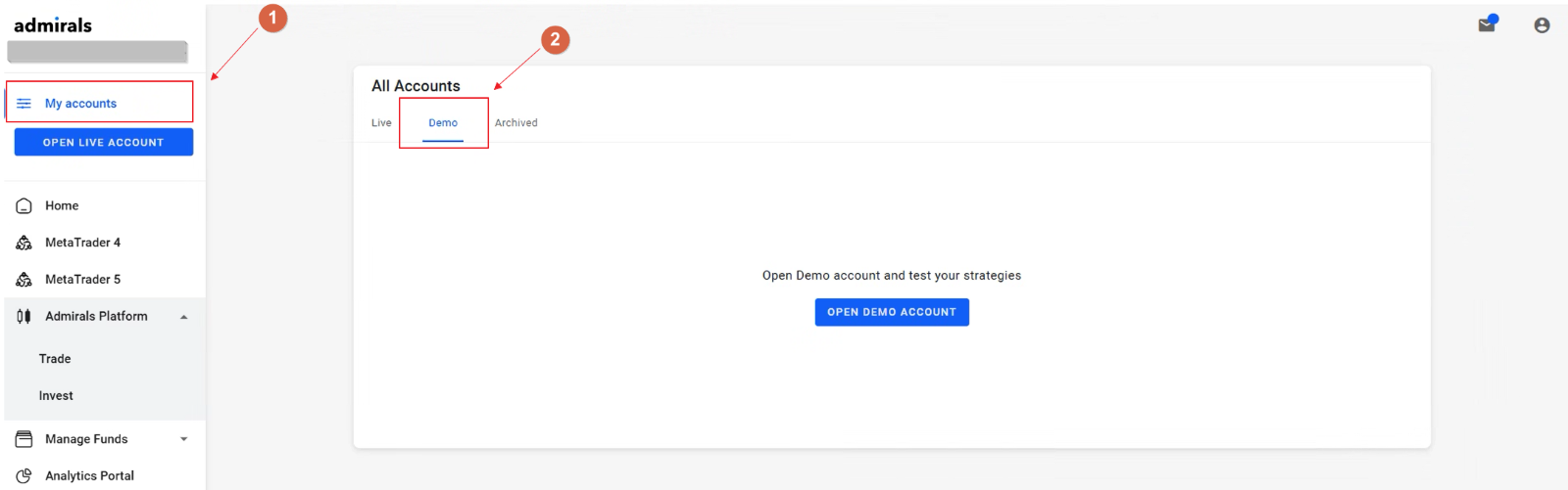 - Inside the Dashboard, look for the "My accounts" section, click "Demo" - “Add account” or “Open Demo Account”,