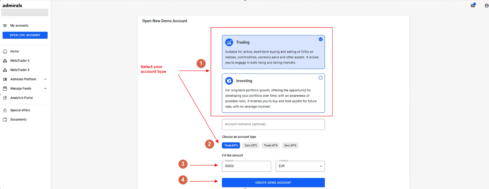 - Choose your account type, currency where needed, and click “Create demo account”.