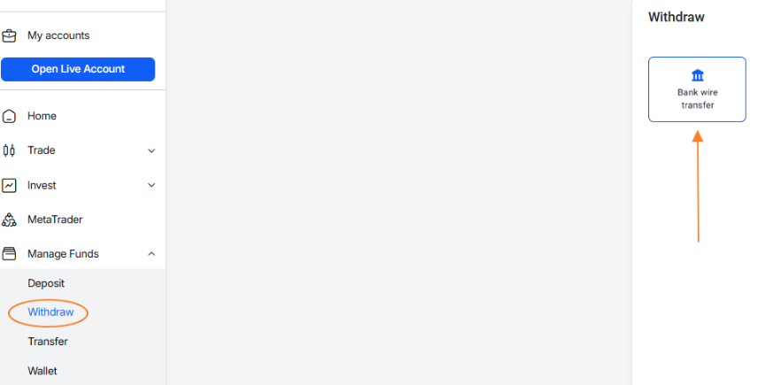 - Open the "Manage Funds" menu again and select "Withdraw." In this section, you can see the available funds withdrawal methods. If you want to withdraw funds to your bank account, choose "Bank wire transfer" and transfer the funds from the wallet to your bank account.